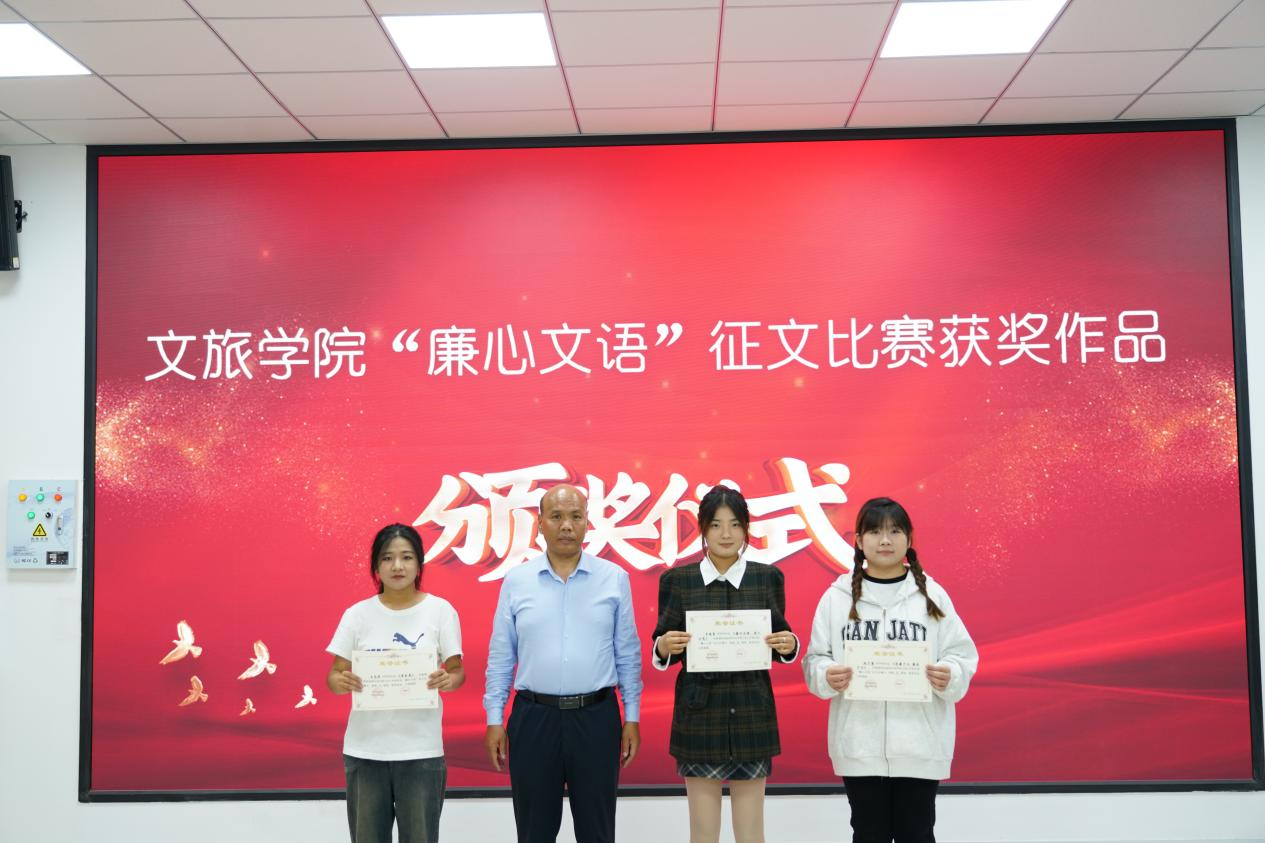 在学校征文比赛评选中,王尧彤同学的《清若莲》荣获一等奖,赵子萱同学的《清廉于心,廉洁于行》和王靖雪同学的《廉心文语,深入心灵》分获二等奖。纪委副书记陈其海为获奖同学颁奖,并勉励同学们在学习和生活中要从点滴小事做起,养成尊重法律、正直无私、自律自强等良好的道德品质和行为习惯,确立正确的价值观念,使廉洁意识真正深入到思想中,体现在行为上。