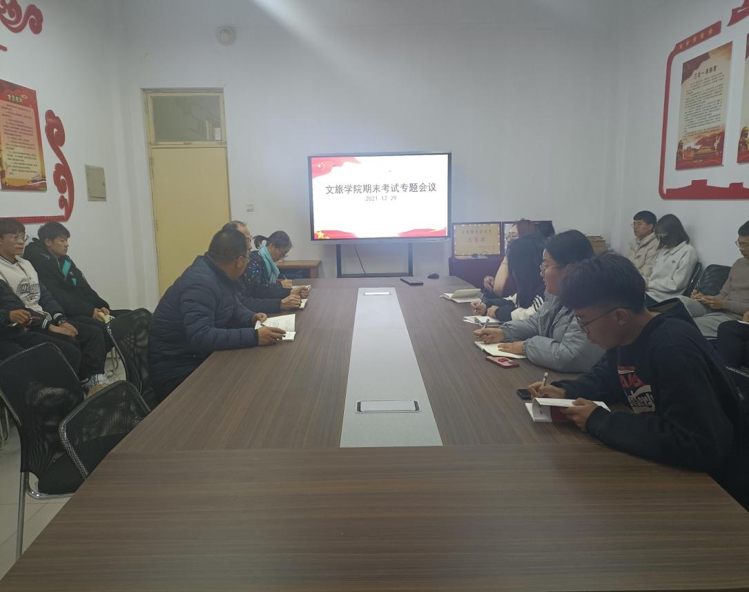 2021年12月29日下午,太阳集团城8722在文信楼232室召开了期末考试专题会议,经理王松江、副经理王剑萍、教务科科长黄加成与会,各班班长、团支书和学习委员参加了会议,会议由黄加成主持。