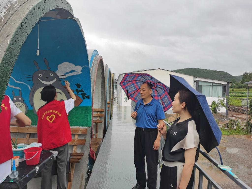 在齐艾产业园,领导们在雨中详细了解了员工们的创作进展,对他们冒雨作画的辛勤付出表示肯定。高馨从构图、色彩搭配、绘画创意等方面对员工们的作品进行了高度评价,并激励同学们要“立足社会课堂,服务乡村振兴,砥砺意志,淬炼青春”。