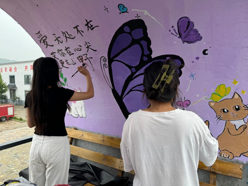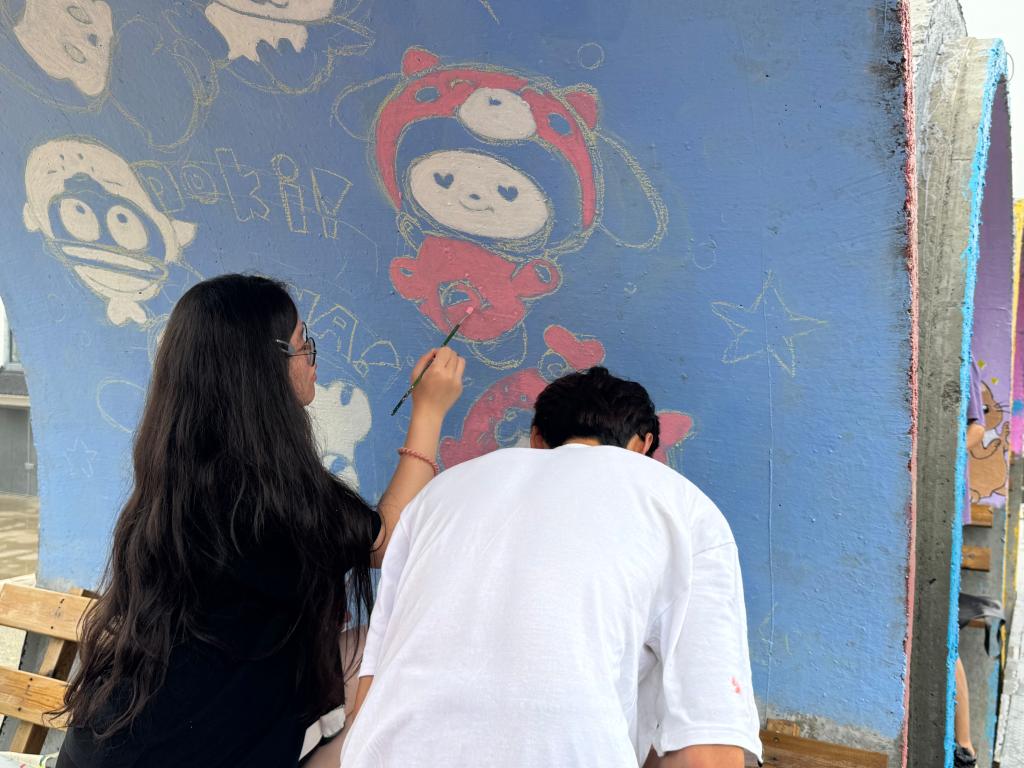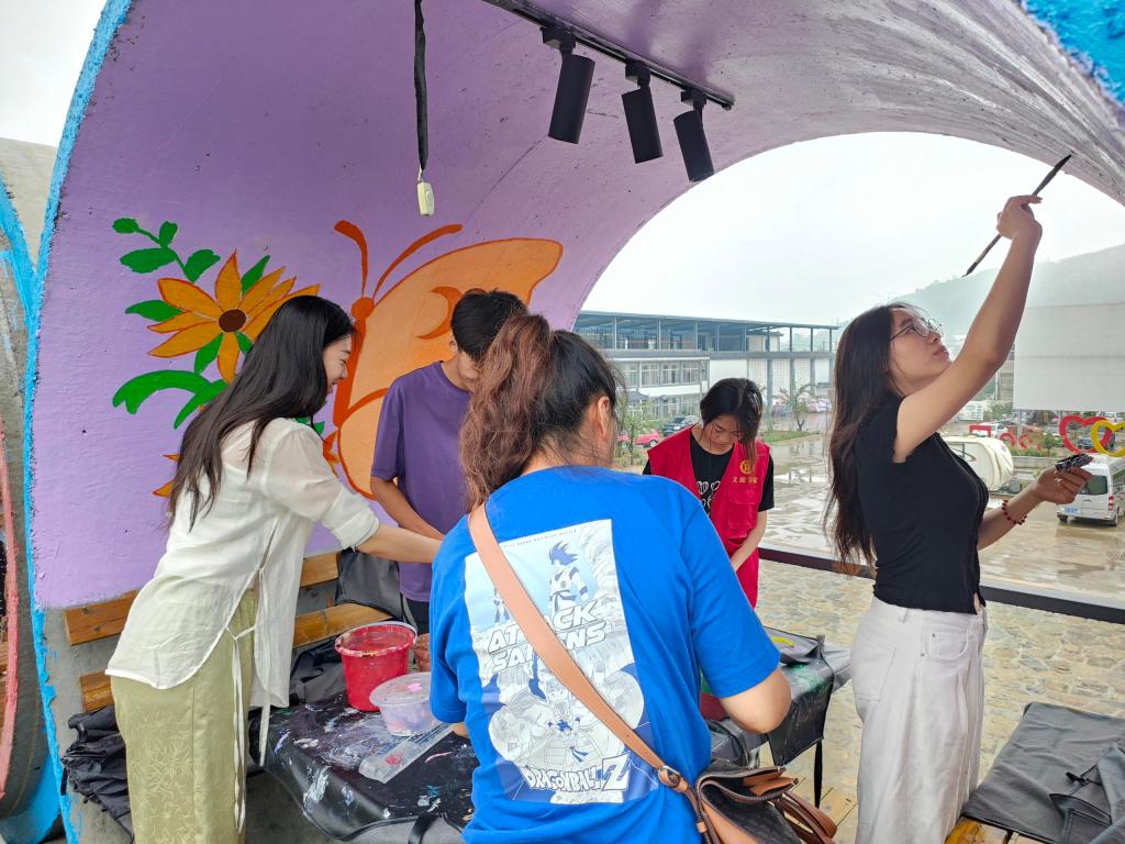 7月20日,志愿服务队队员在墙绘创作的道路上持续前行,充满活力且成果显著。昨日,墙绘的初步完成已经赢得了游客和当地居民的广泛赞誉,这给了队员们更大的动力,继续以饱满的热情和精益求精的态度投入到后续的工作中
