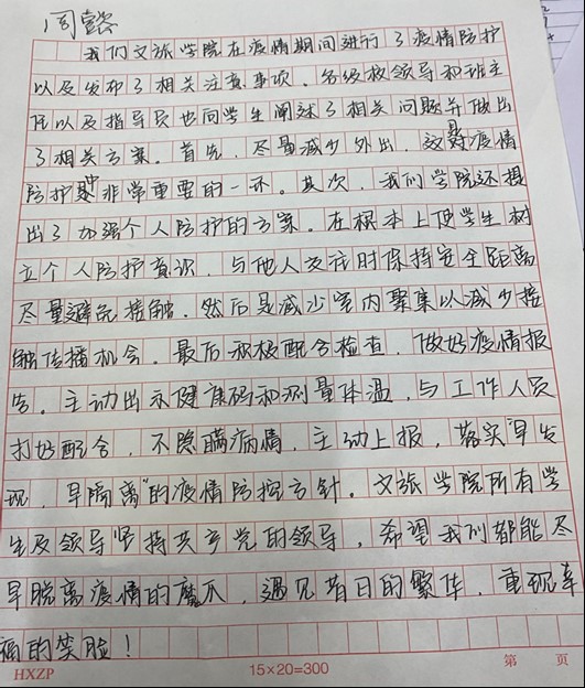 在疫情防控以及发布了相关注意事项。各级校领导和班主任以及指导员也向同学阐述了相关问题并做出合理可行的应对和预防措施。首先,尽量减少外出,这是疫情防护中非常重要的一环。其次,我们学院还提出了加强个人防护的方案。在根本上使员工树立个人防护意识,与他人交往时保持距离。