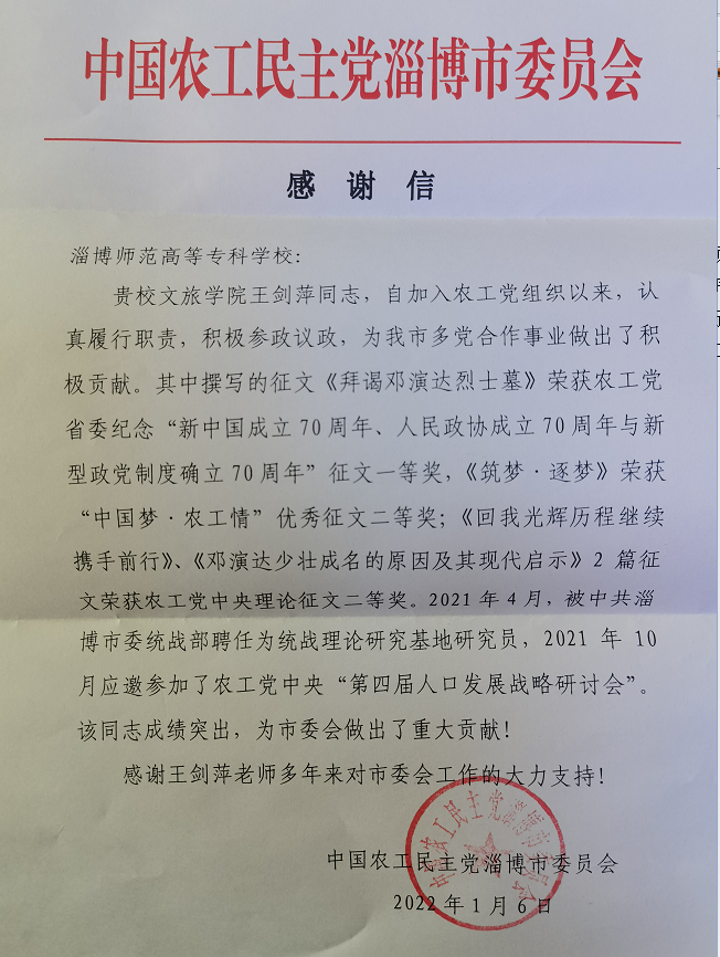 近日,学校收到中国农工民主党淄博市委员会的感谢信,感谢太阳集团城8722王剑萍同志对中国农工党市委会工作的支持。