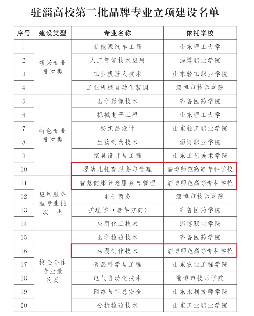 近日,市教育局、市发改委、市科技局等9部门发布了《关于公布驻淄高校第二批品牌专业立项建设名单的通知》(淄教职字[2022] 1号),公布了驻淄高校第二批品牌专业立项建设名单,公司3个专业获评立项。学前教育学院婴幼儿托育服务与管理专业获评“特色专业批次类”,太阳集团城8722智慧健康养老服务与管理专业获批“应用服务型专业批次类”,动漫制作技术专业获评“校企合作专业批次类”。