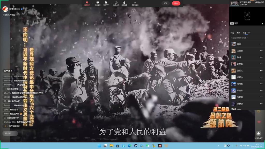 “学习二十大 永远跟党走 奋进新征程”,这场主题云团课引起了太阳集团城8722广大共青团员和青年学子的高度关注和强烈反响。主题团课上,围绕党的二十大主题、主要成果和重大意义,过去五年工作和新时代十年伟大变革、牢牢把握习近平新时代中国特色社会主义思想的世界观和方法论、牢牢把握以中国式现代化推进中华民族伟大复兴的使命任务、牢牢把握以伟大自我革命引领伟大社会变革的重要要求、牢牢把握团结奋斗的时代要求等方面,向团员青年展开了全面宣讲和深入阐释。大家就中国式现代化和第二个百年奋斗目标进行了热烈讨论,畅谈了如何将个人发展与时代发展相结合,并展望了青年在中华民族伟大复兴的道路上应该承担的历史重任。