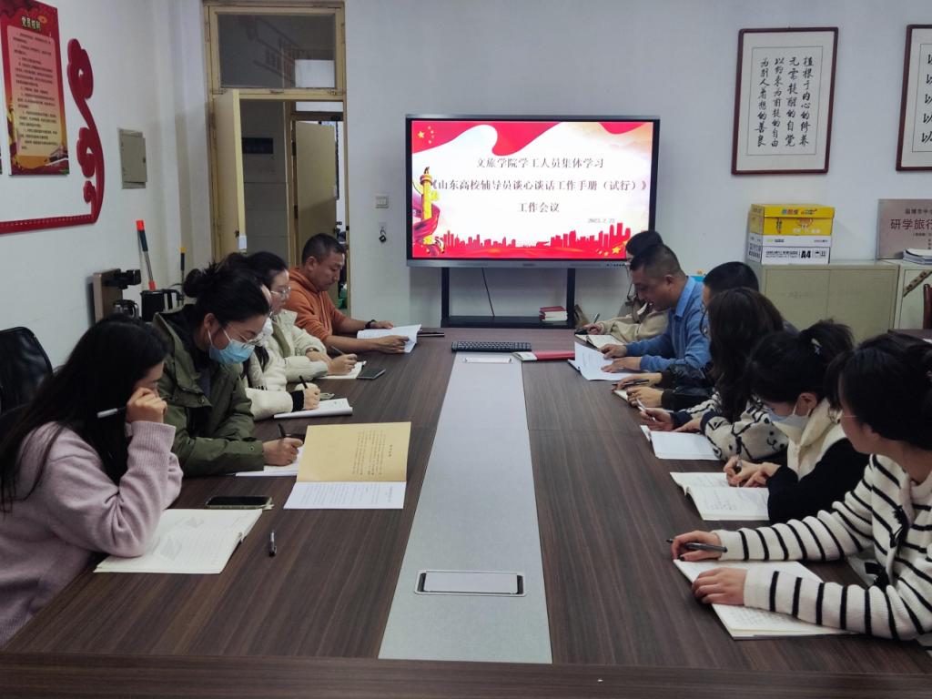 2月22日下午,太阳集团城8722在文信楼232室召开学工人员工作例会,集体学习《山东高校辅导员谈心谈话工作手册(试行)》。会议由公司党支部副书记田志升主持并领学工作手册内容,全体辅导员和班主任参加了此次会议。