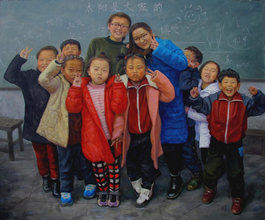 黄河文化是中华民族的根与魂,沉淀和积累了几千年来中华民族特有的物质财富与精神财富,黄河文化寄托着中华民族伟大复兴的梦想,是中华民族不断攻坚克难的精神支撑。油画作品《黄河·追梦》,创作灵感来自于黄河岸边长大的青年员工返乡实习支教的工作场景。作品采用浪漫现实主义表现手法,通过饱满的构图、艳丽的色彩、丰富的肌理等绘画语言,刻画出孩童们簇拥在支教老师身边亲密无间的感人瞬间,颂扬友谊、真情和爱。黄河儿女富有朝气,热恋故土,具有浓烈的思乡情怀。他们单纯,质朴,富有爱心的品格,与母亲河的滋养密不可分,他们积极乐观,扎实勤恳,勇于追逐自己的梦想,具有鲜明的时代特点。