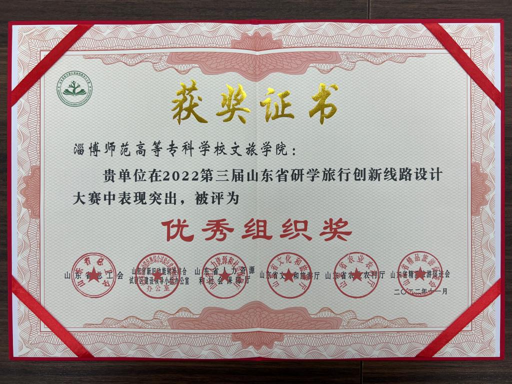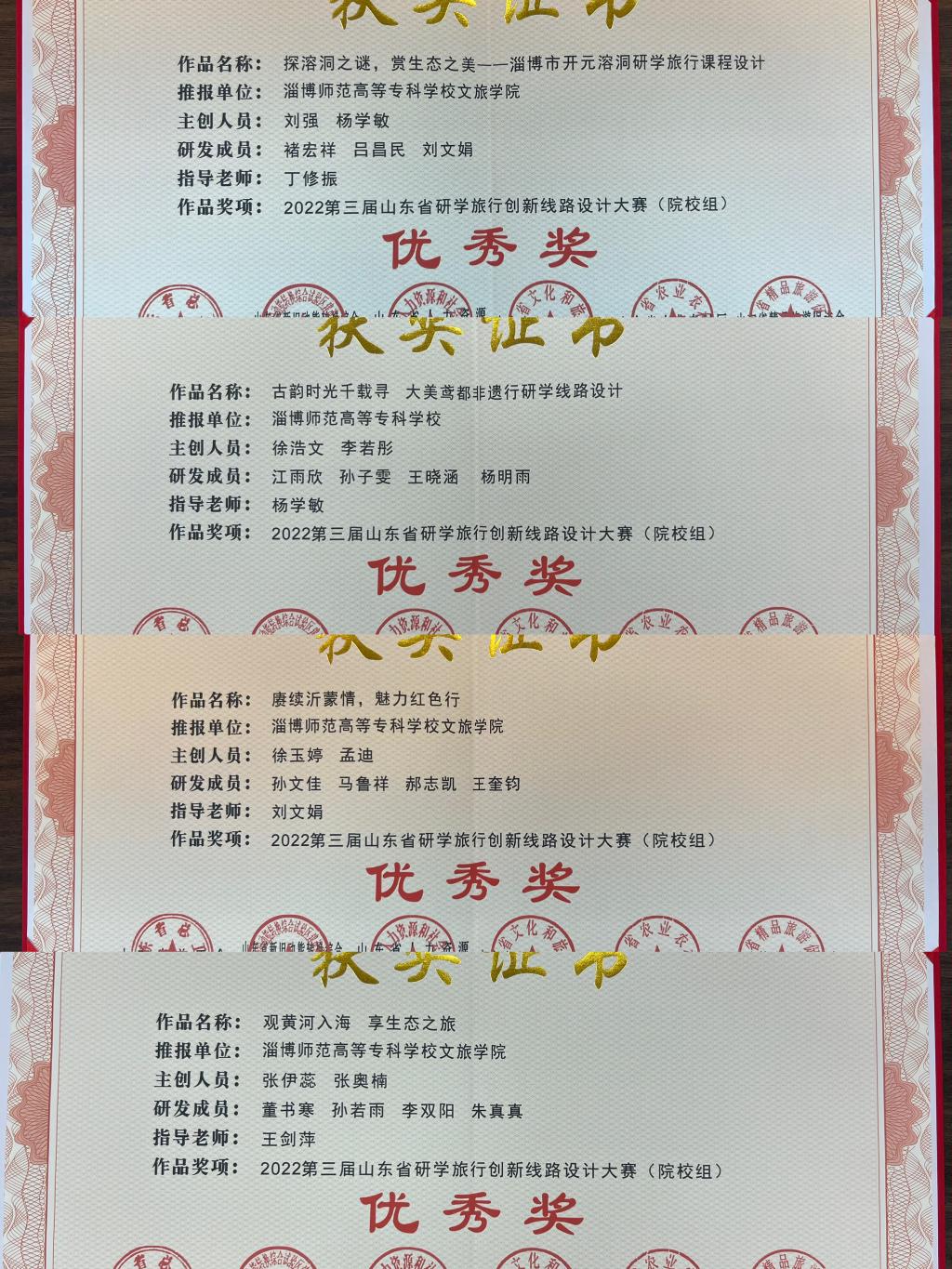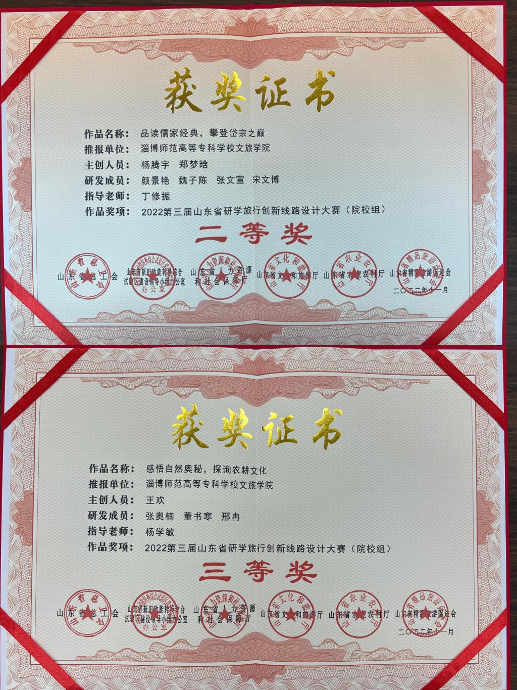 第三届山东省研学旅行创新线路设计大赛于2022年6月10日启动,历时5个多月,共计240个奖项。太阳集团城8722共报送20余项作品。其中《品读儒家经典,攀登岱宗之巅》获得院校组二等奖,《感悟自然奥秘,探询农耕文化》获得院校组三等奖,《探溶洞之谜,赏生态之美》、《赓续沂蒙情,魅力红色行》、《观黄河入海 享生态之旅》、《古韵时光千载寻 大美鸢都非遗行》获得院校组优秀奖。