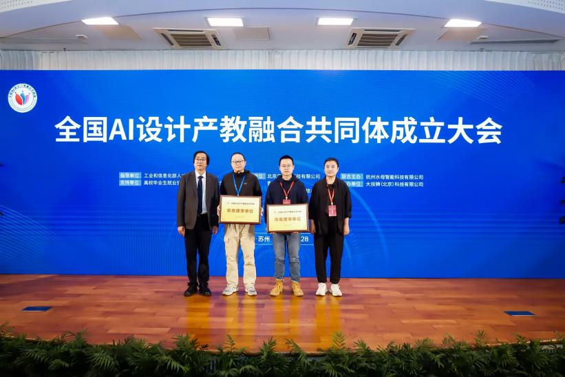 公司作为共同体常务理事单位,参加了授牌仪式,苏州工艺美术职业设计学院副董事长与杭州水母智能科技有限公司创始人为院校代表授牌。
