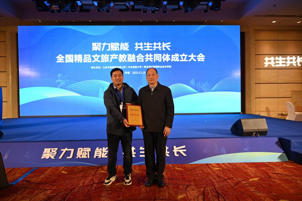 全国研学旅行产教融合共同体由山东文旅集团、中央民族大学、青岛酒店管理职业技术学院牵头共同组建,并在教育部管理下,联合169家行业组织、学校、科研机构、上下游企业等共同参与,以期培养更多高素质高技能的文旅人才,全面强化对全行业发展的支撑。大会宣读了共同体章程(草案),公布了共同体组织架构和第一届理事会理事长单位、常务副理事长单位、副理事长单位、常务理事单位并授牌,公司被选定为副理事长单位。