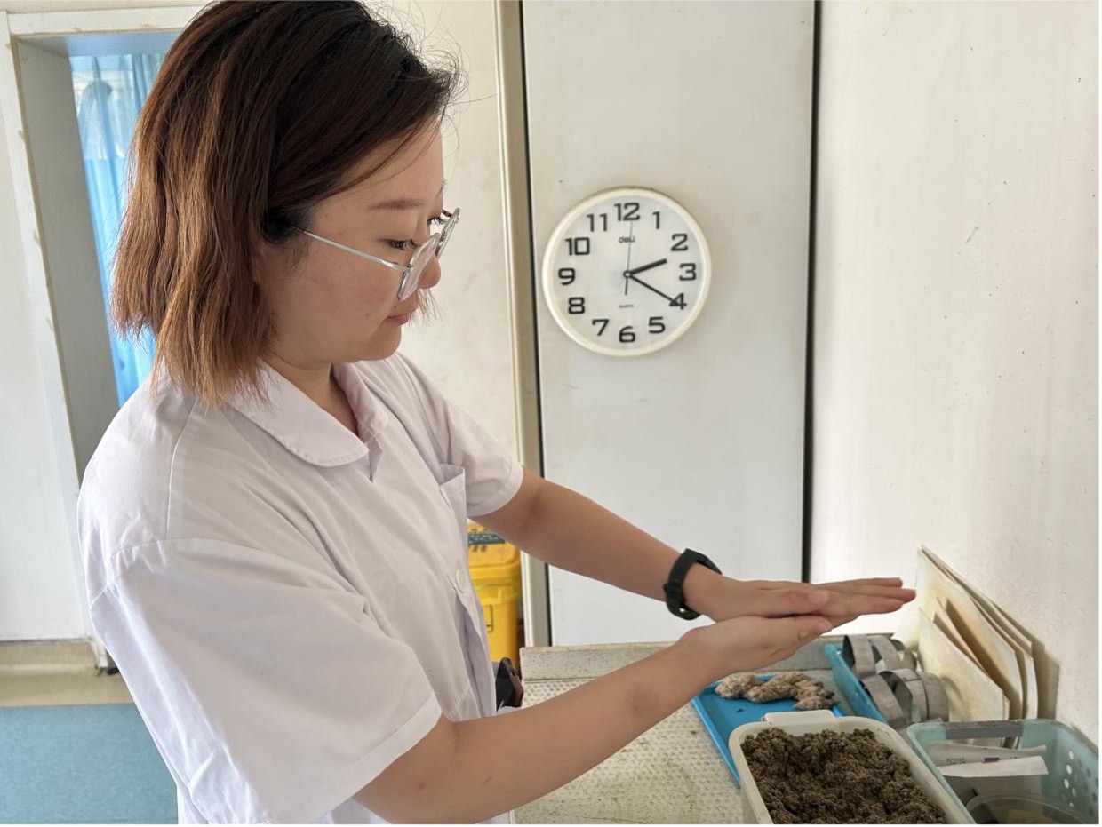 5天时间内,两位教师在中医针灸科、中西医结合科、中医康复科实习。跟随周毅德教授及科室医生出诊、查房、书写病历,参观中医健康大厅、老年疗养院、扁鹊书馆,观摩并实践督灸、针刺、放血、砭石理疗技术,学习了精湛的专业技能,提高了临床实际操作能力,培养了独特的中医康养思维。