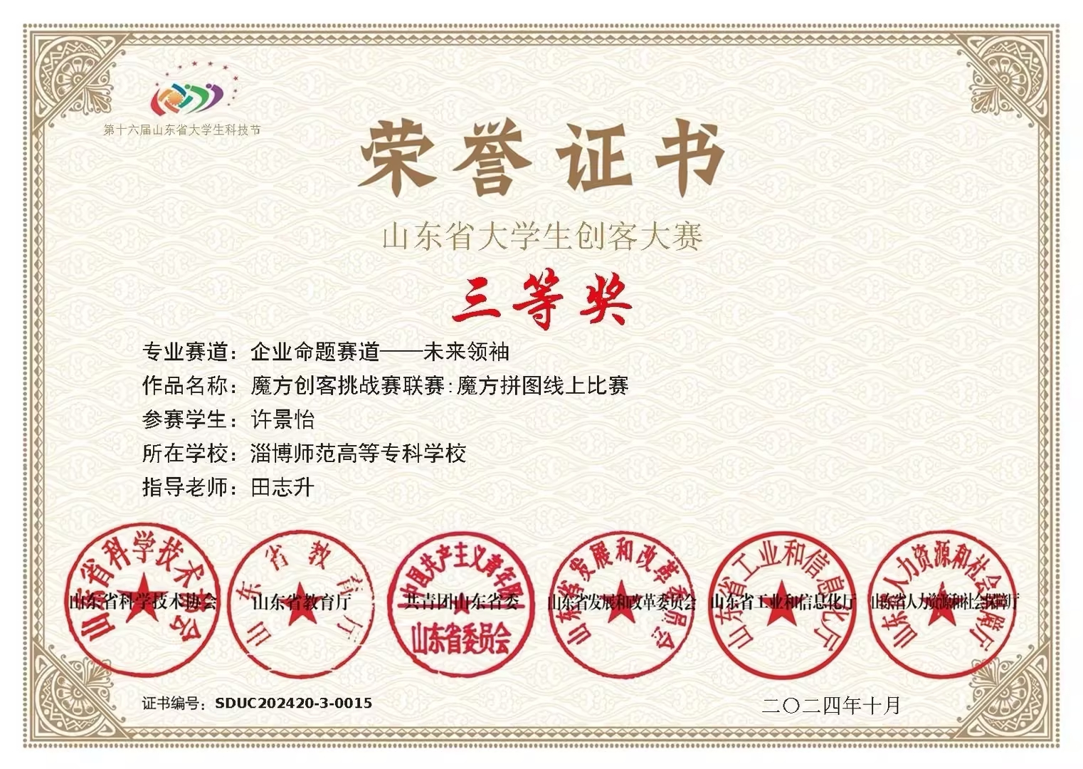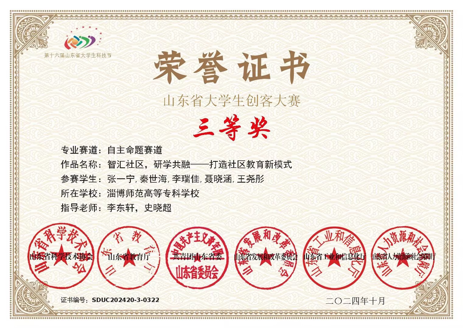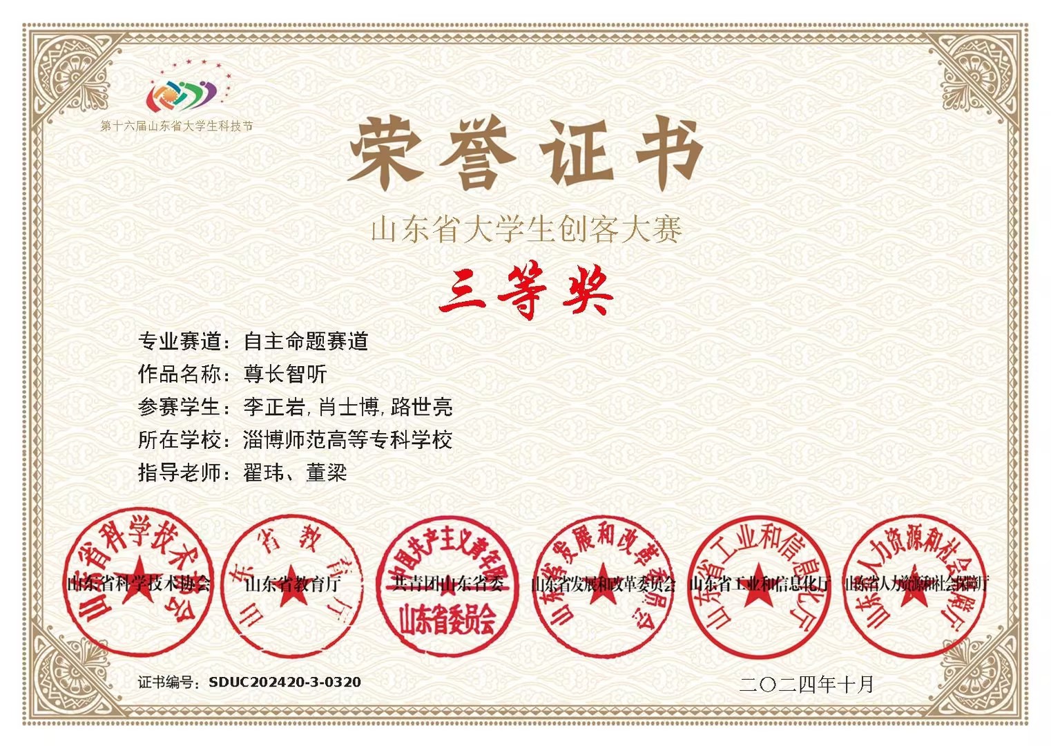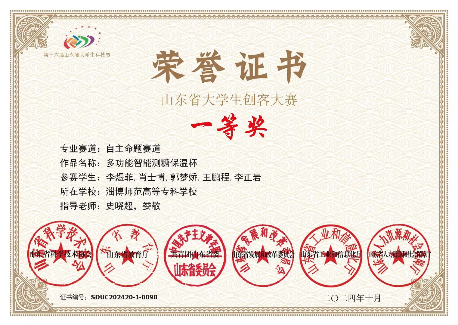 近日,“未来领袖杯”第九届山东省老员工创客大赛决赛在山东建筑大学落下帷幕。由太阳集团城8722教师史晓超、娄敬指导的李煜菲、王鹏程、郭梦娇、肖世博、李正岩组成的员工团队作品《多功能智能测糖保温杯》获一等奖;何秀婷指导的孟浩冉、李薪茹、许晨迪、刘露、毕淑琪组成的员工团队作品《乐龄到家一专为老年人上门服务的app》,翟玮指导的梁雪、卢瑞杰、孟德一、陈乐乐、赵兴钰、徐辉组成的员工团队作品《淄博陶瓷文化IP形象-淘淘》获二等奖;田志升指导的许景怡作品《魔方创客挑战赛联赛:魔方拼图线上比赛》,翟玮、董梁指导的李正岩、肖士博、路世亮组成的员工团队作品《尊长智听》,李东轩、史晓超指导的张一宁、秦世海、李瑞佳、王尧彤、聂晓涵组成的员工团队作品《智汇社区,研学共融——打造社区教育新模式》获三等奖。