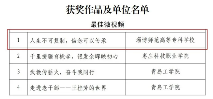 近日,山东省教育厅关心下一代工作委员会发布了《关于2024年“读懂中国”活动作品评选情况的通报》,由公司教师娄敬指导的张宇衡、耿晓迪等员工创作拍摄的《人生不可复制 信念可以传承》荣获优秀微视频奖。